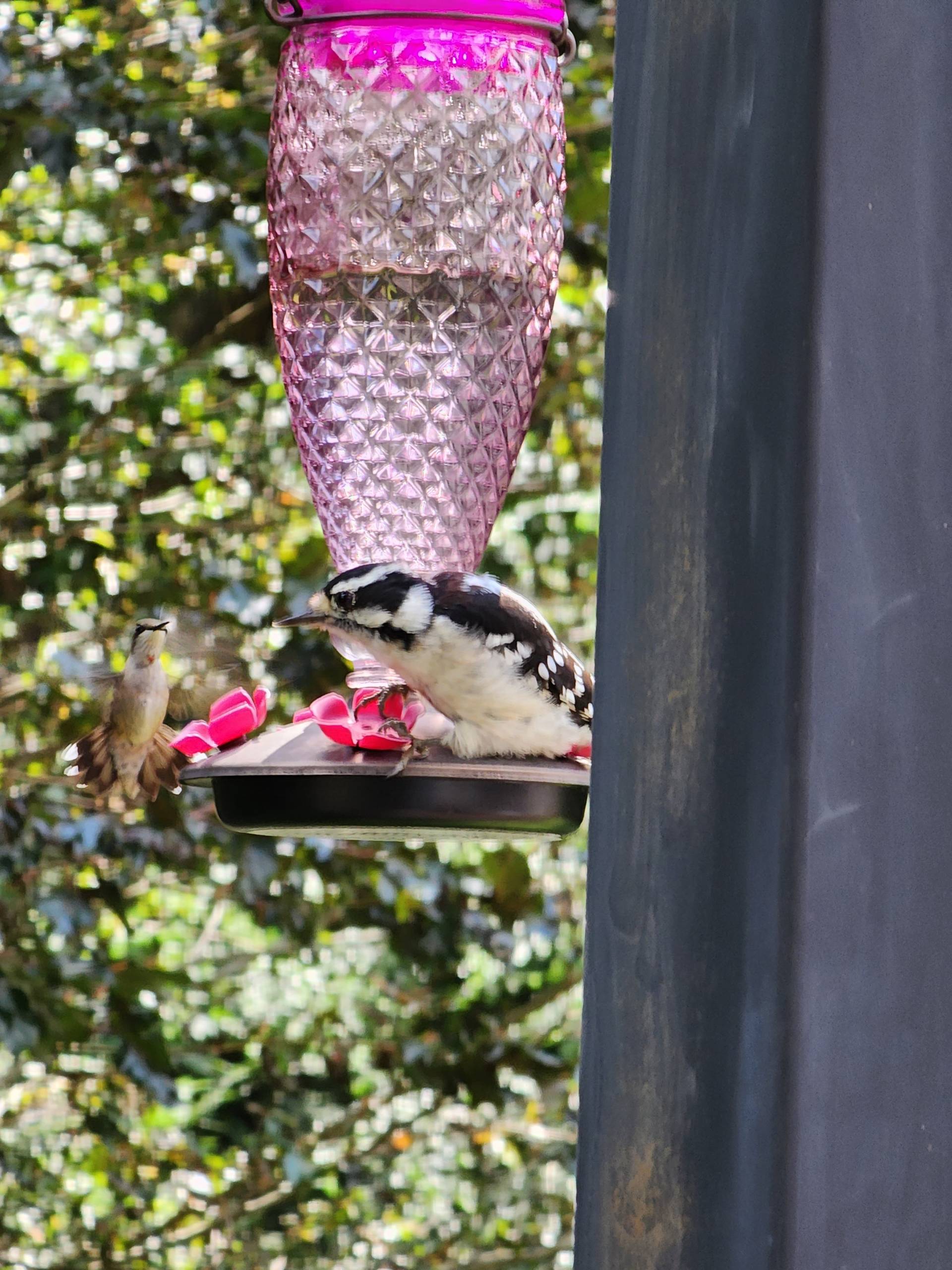 Now, back to the Hummingbird vs Woodpecker picture. Clearly the woodpecker is being assertive in this picture, and the hummingbird is weighing her options.