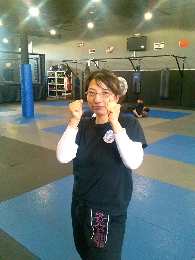 Maria says that her training keeps her “springy on her toes.” It gives her a good physical stance, and she feels like it’s fun exercise; it’s not just a workout. She says that, while she takes her workouts and training seriously, she is still able to laugh and have a good time. She particularly noted that the martial arts have opened her world up to some great relationships. She’s met some wonderful and amazing people, and she says that she even made friends and a new workout partner at a recent seminar she attended (Emily Kwok, Valerie Worthington, and Art Keintz). Maria also noted that her martial arts training has helped her to become more confident.